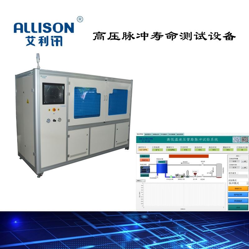 试验机多于产品的整机耐压、脉冲、爆破、密封性是否达到设计要求。寿命试验机采用17寸PLC/工控机控制,通过相关参数设定与控制完成相关试验。